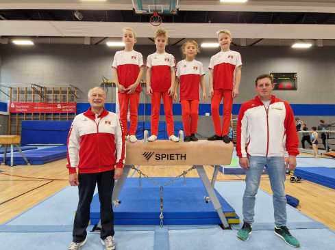 Auf dem Foto sind der Trainer Jürgen Wagner, die Turner Moritz Kaiser, Henry Burbach, Gayeon Zeiler und Leon Hahmann sowie der Betreuer Maik Burbach zu sehen. Es fehlen