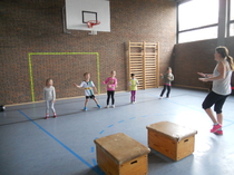 Die beiden Bilder zeigen unsere Trainerin Christina mit den Kleinen in Aktion und mit den Großen zu Beginn des Trainings.